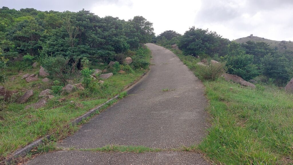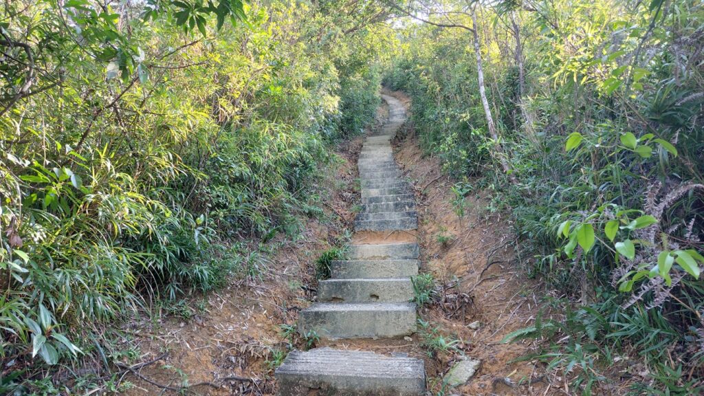 從針山山頂沿另一邊的水泥級急降至林道。沿林道一路上行至草山山頂。按指示下山,沿梯級小徑至馬路行抵鉛礦坳。這段操練上斜能力。