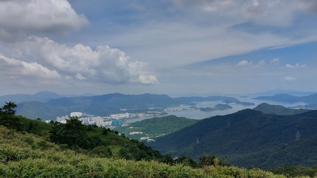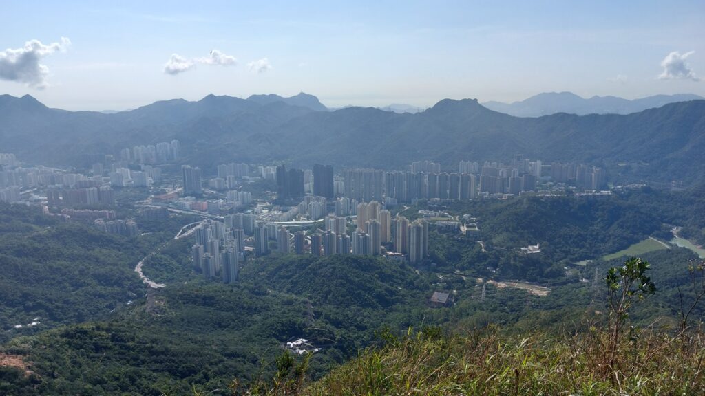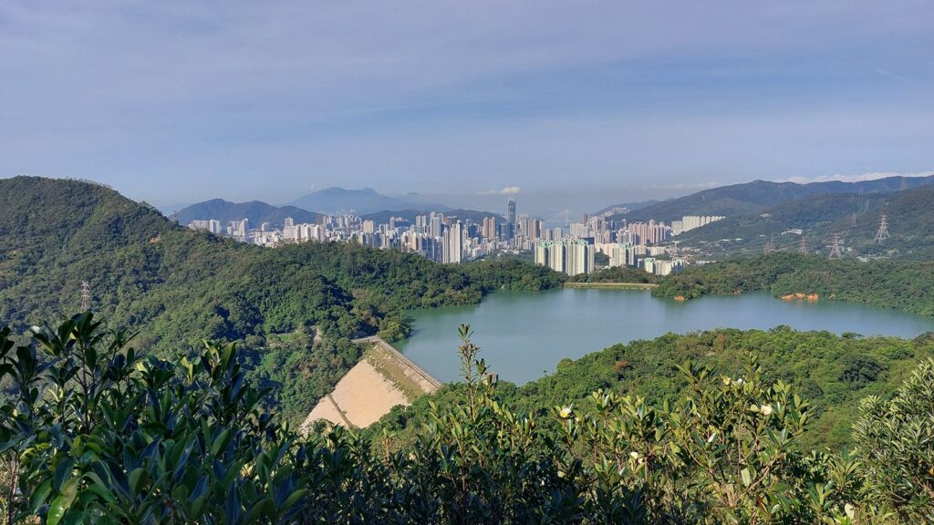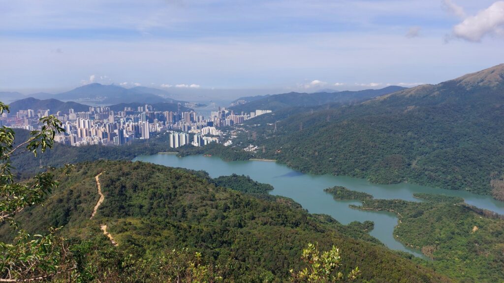 城門水塘全景。城區的荃灣、葵涌及青衣,遠處的屯門及大嶼山