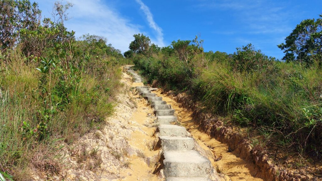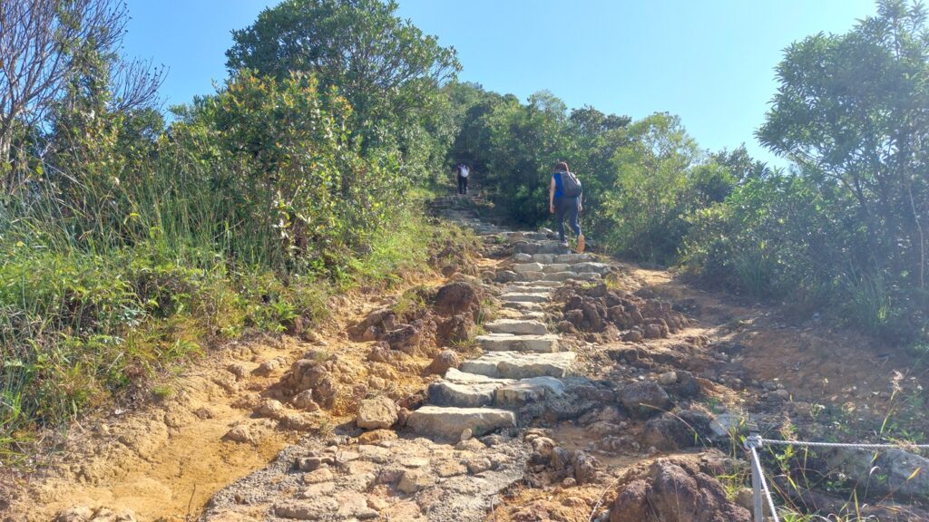 長且陡斜的梯級登上針山頂。這是本程最辛苦的一段,操練攀登能力