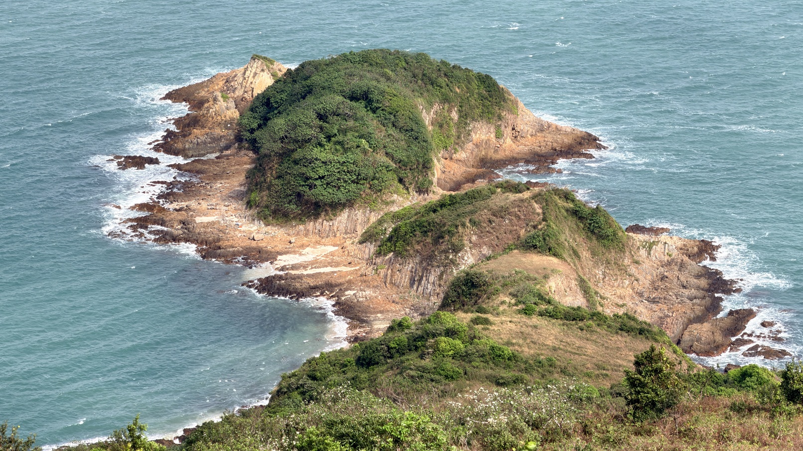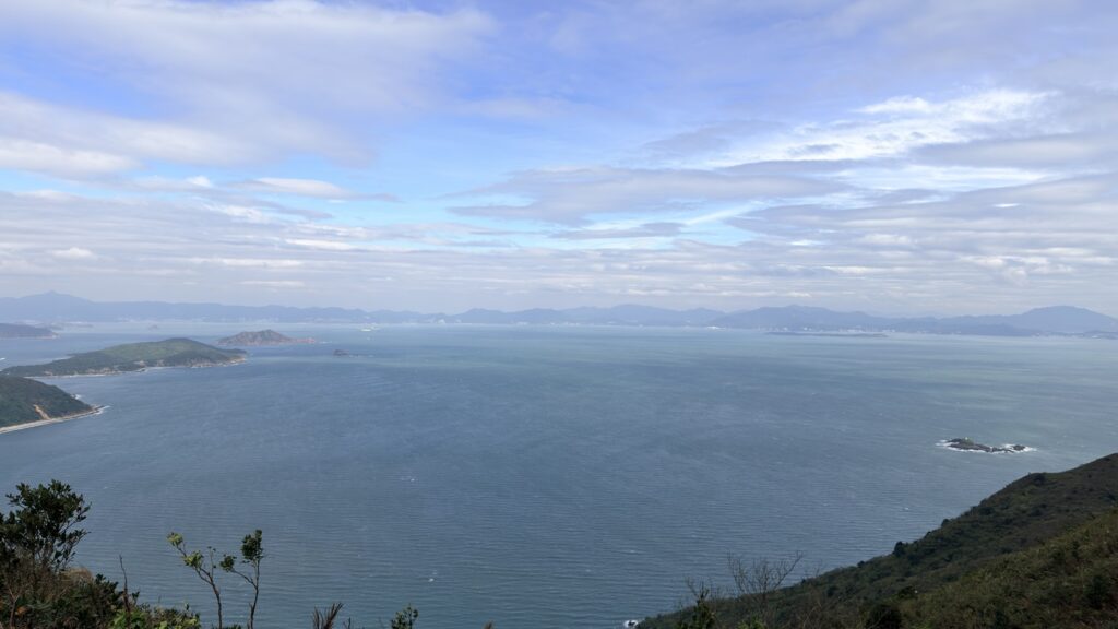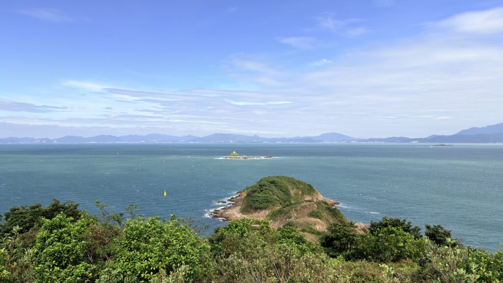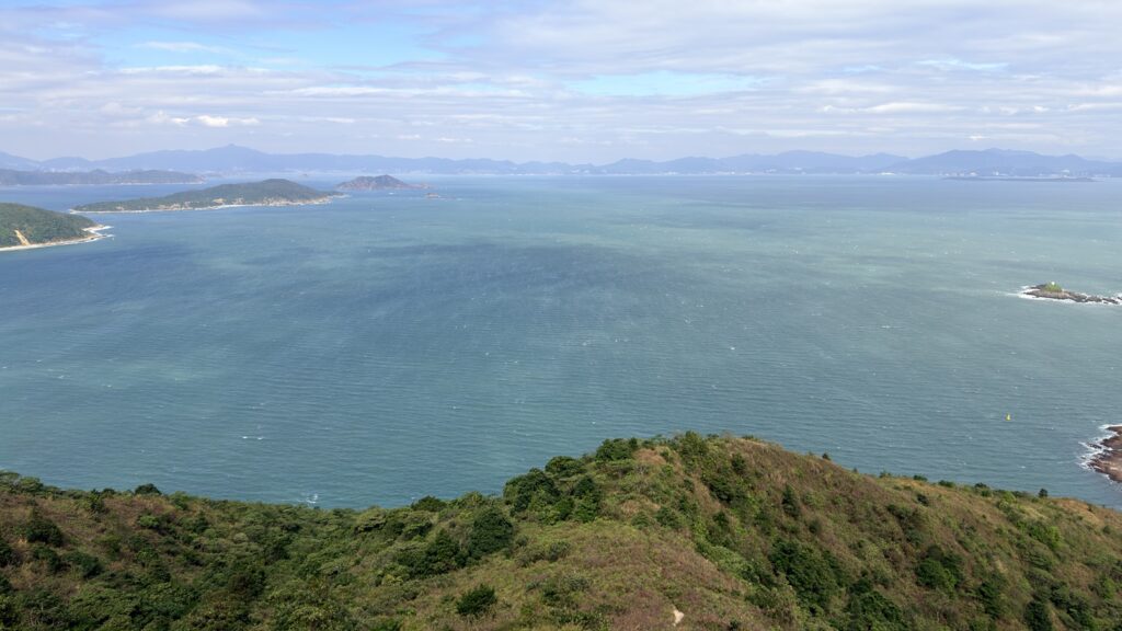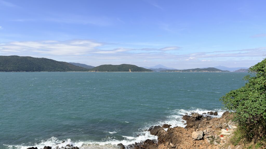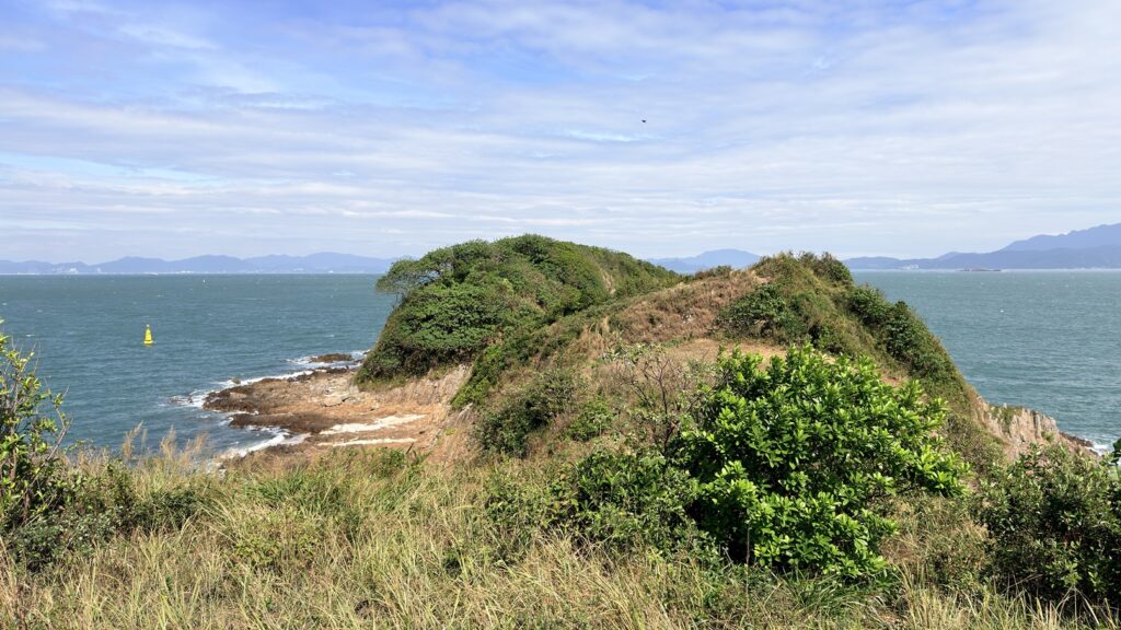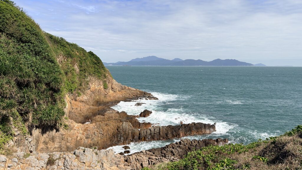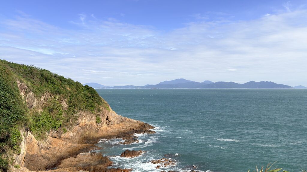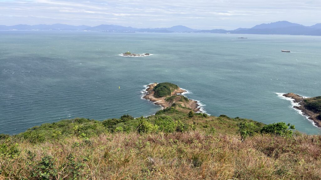 米粉咀景色還是很靚的。咀本身由火山柱狀岩構成,在海水的沖刷下,形成各種獨特的形狀。海浪打在岸邊,白色的浪花此起彼伏。周圍有深灣、蚺蛇灣,還有深灣角、黃茅洲、赤洲、塔門,及廣闊的大鵬灣。本來全程雲層太厚天色陰暗,但到達米粉咀時卻藍天白雲,光線充足,天助我也。