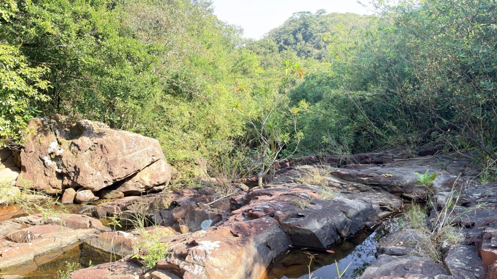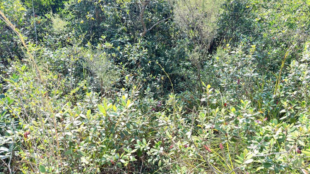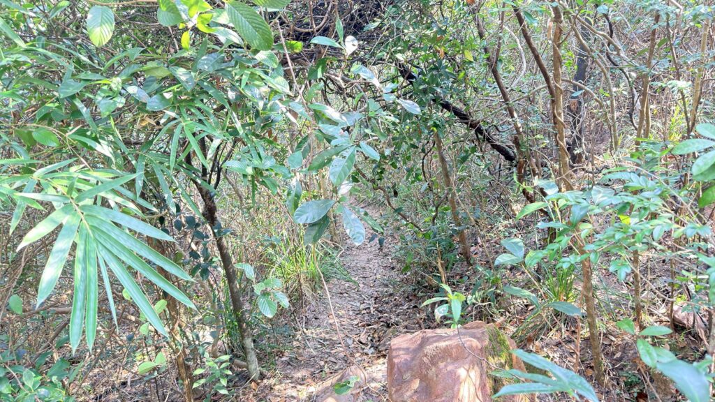估不到的是由紅石門至跌死狗一段。這段長兩公里多,前段至烏洲塘,路徑相對清晰,雖崎嶇也在預料之中。而後段,上攀,路徑崎嶇陡峭也屬正常。只是行時發現,此路幾乎很久沒人行過了,至少一個月內沒人行過的痕跡。結果就是,路徑草叢樹枝太多,相當多的路胚根本看不到,需要不時揾路;路上也不時有樹枝及冧樹擋道,不時要踎低穿過,甚至需繞道開路而行。這不但加大了前行的難度,要消耗大量的體能,而且還浪費太多的時間。