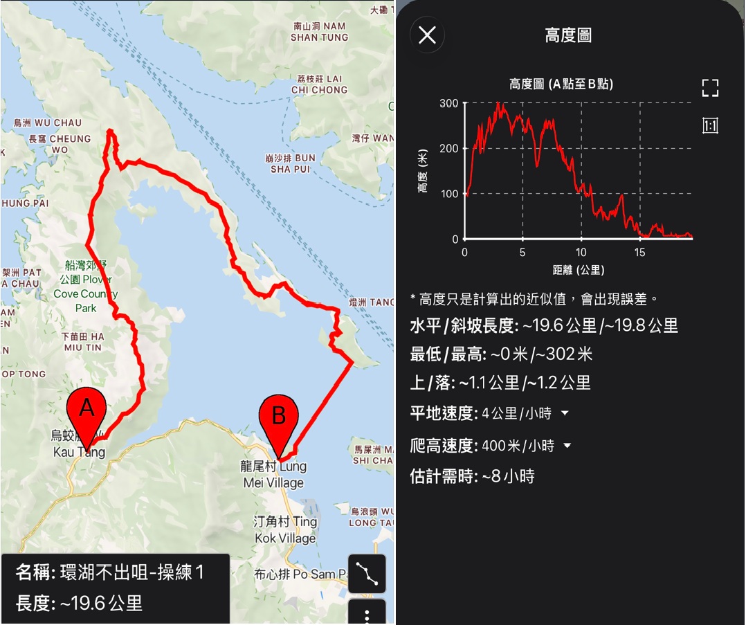 7.用時預估︰跌死狗3.5時,小滘坳4時,6時副壩,大美督7時。