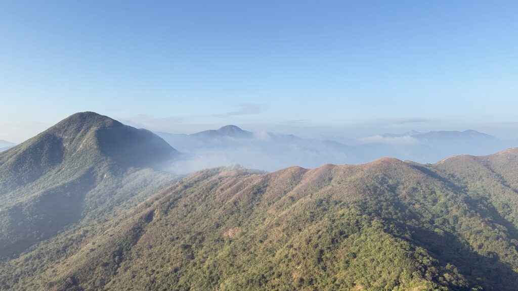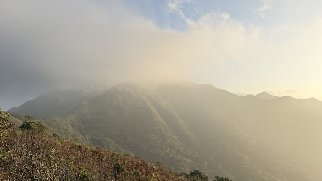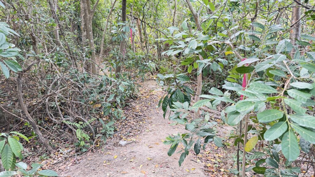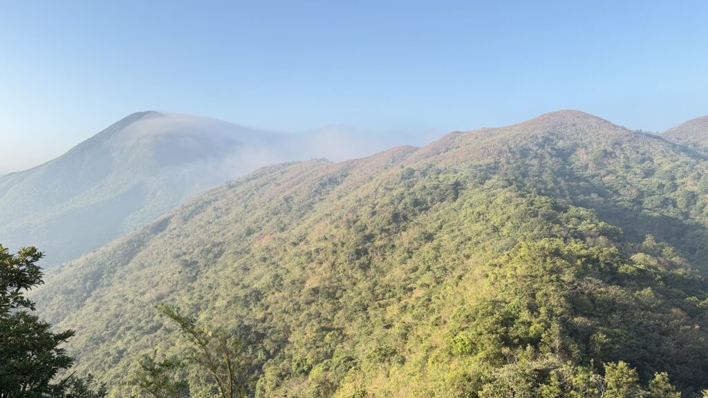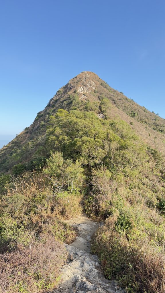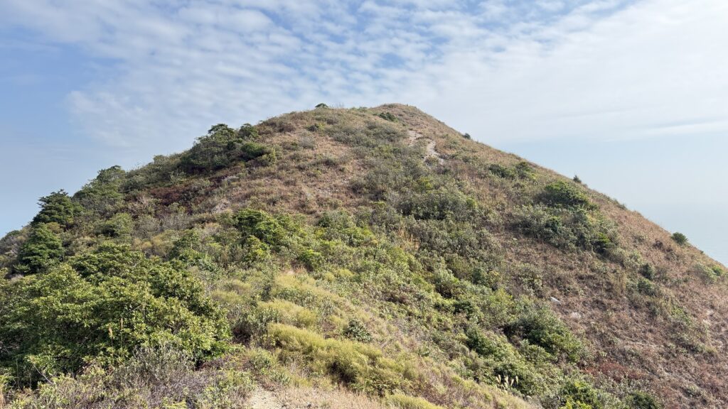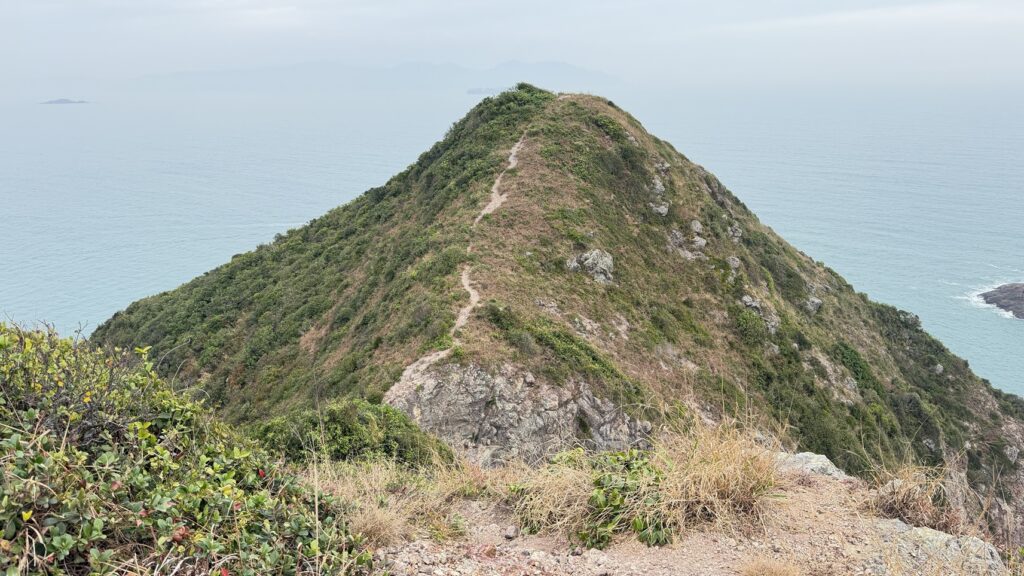 當行到短咀的第四個山峰時,看了下四周的環境,第五個山峰就在眼前。做功課時就知道要過去的小徑難行且有危險,當無法直接看到前方路況時,只好落山坳,小心翼翼慢慢前行去查看。剛行幾步,就知道小徑崎嶇多浮沙,浮滑難行。再前行一會就看到腳下右邊的懸崖,垂直,很高,崖面還有彎曲的深溝,看著驚心。試著前行幾步,有比人稍高的樹叢,樹上還有鉤刺,這時還看不清前方的路況。知道有危險,還看不清,不知風險有多大!定神稍思考,路徑不熟,風險難以評估,自己獨自一人,很快決定不再冒險前行,退回第4個山頂。