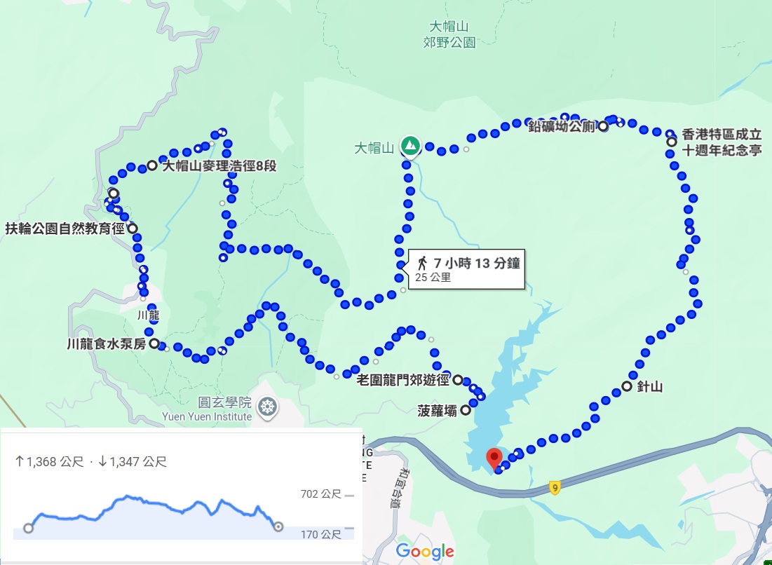 - 路線: 菠蘿壩➡龍門郊遊徑➡扶輪教育徑➡大帽山頂➡鉛礦坳➡草山➡針山➡城門水塘
