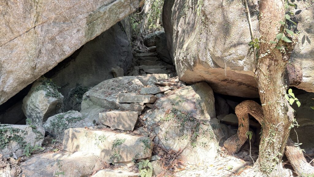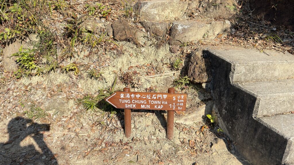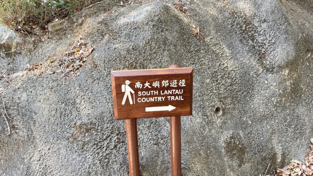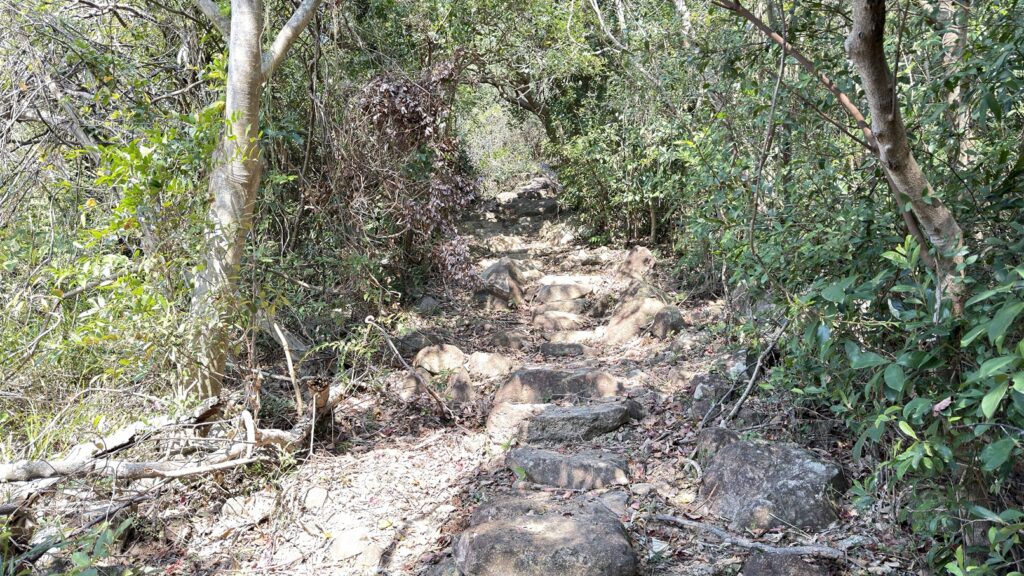 在塘福引水道岔路轉行南大嶼郊遊徑。此段前部分是較陡峭的連續向上石梯級,攀升200多米,本程最辛苦的一段。中後段為石陣路和橫山徑,半跑半行。