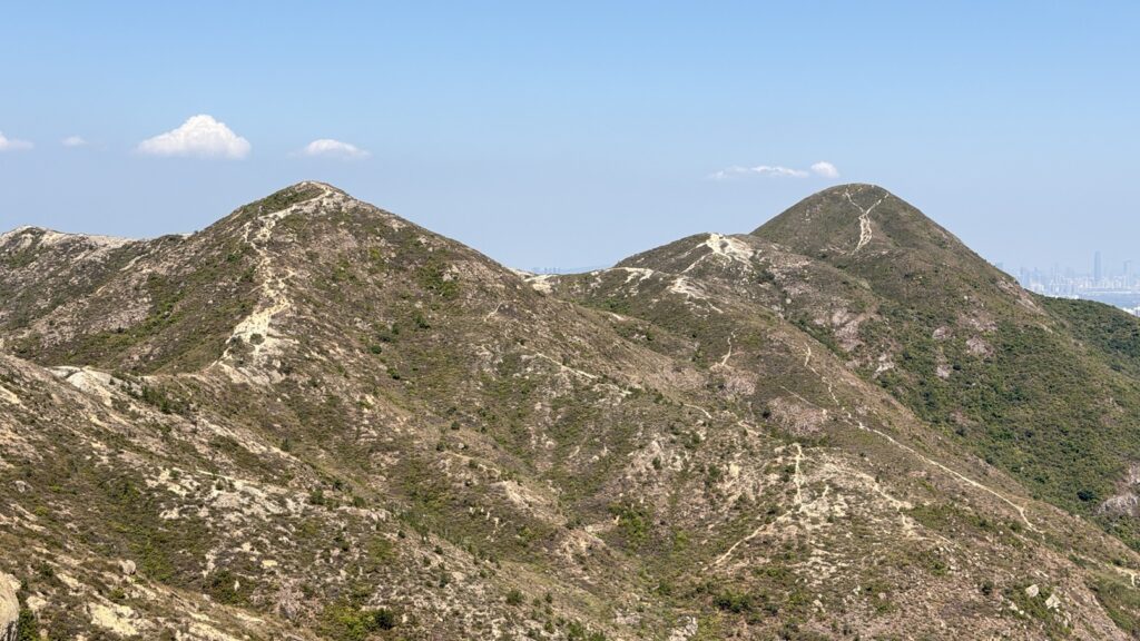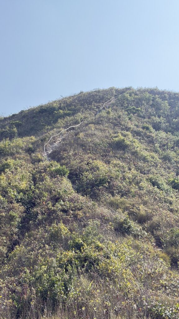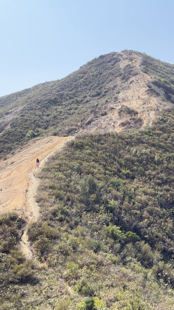 行程起步就需行極斜的石屎路上攀,也許是未熱身的緣故,感覺很辛苦,至行梯級時感覺好多了。由青山頂以後的路徑,就變得非常難行,這也是這條路線的價值所在。不斷上上落落,極斜的上下坡極多,嚴重風化的路徑極浮滑,上坡和下坡都難以企穩,行時極易滑倒。手套及行山杖必不可少,能減少體能消耗,也可加快速度。體能、技巧、經驗,加上手套和行山杖,是完成這條線路的訣竅。本次能順利完成,給以後的另三條考牌路線增加了信心。